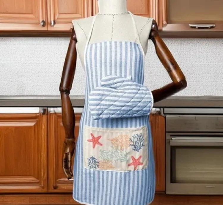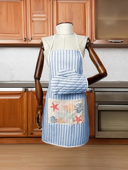 Magic Lady Blue White Striped Pocket Sea Themed Kitchen Apron and Oven Mitt