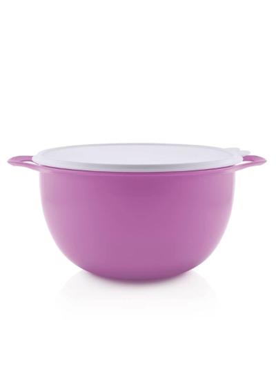 Tupperware Mixer Bowl 10l Purple My mixer bowl is designed for storing, transporting, serving, kneading dough and marinating. The moisture-resistant lid keeps stored food fresh for longer. My mixer bowl 10 litres is more portable The contents will never spill or leak. The base has a wide handle with a thumb hole for storage during cooking and for hanging on a kitchen hook. My mixer bowl with a volume of 10 litres has two tabs for a secure grip. A tab on the lid for easy opening. The bowls save space in indoor kitchen cabinets. Use it to knead bread dough, marinate meat, serve large batches of fruit and vegetables. My mixer bowl 10 litres is suitable for preparing, storing and serving large quantities of preparations and pickling vegetables. Not suitable for microwave or freezer. Temperature range from 0 °C to +85 °C. To prevent the lid from deforming, do not close it until the contents have cooled. Dishwasher safe. Volume: 10 LitersDimensions: 32.5 cm, height 18.6 cm