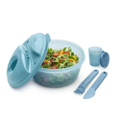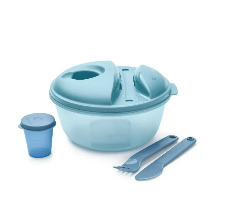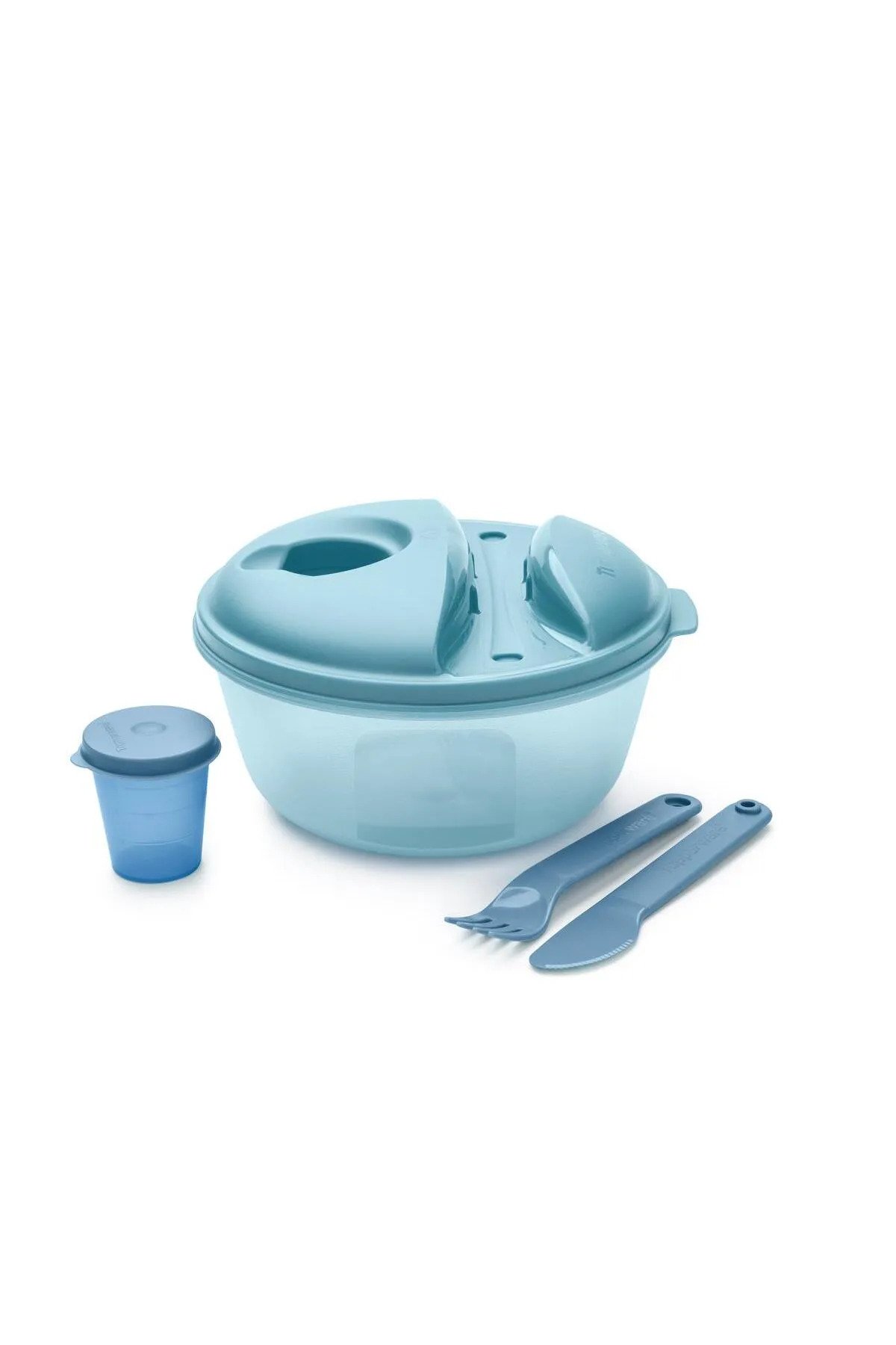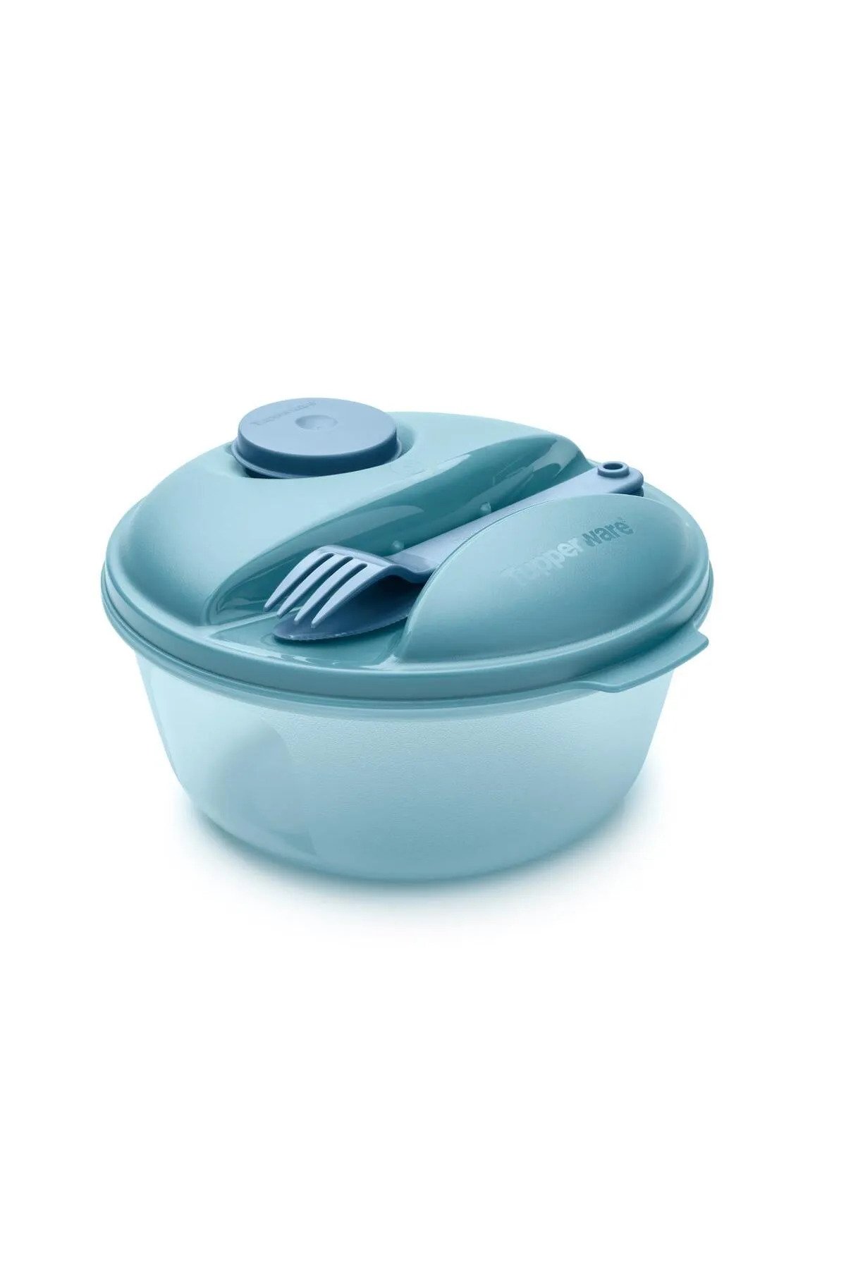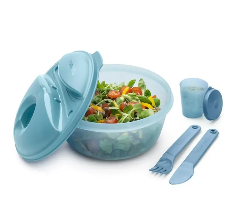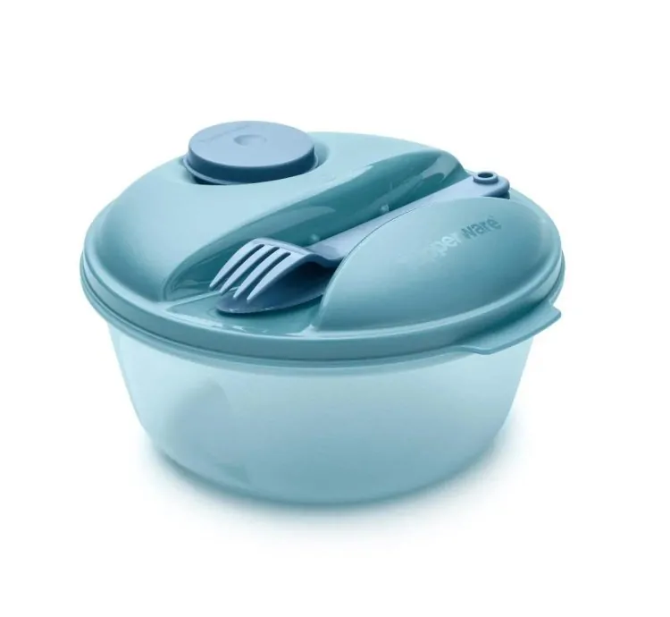 The Tupperware Salad Storage and Transport Container 1.5 lt is specially designed to keep your salads fresh and easily transportable. Thanks to its tight-sealing lid, you can securely carry your meals, and with the included cutlery, you can enjoy your food anytime. The small sauce container ensures that your dressing stays intact without spilling or getting lost. The cutlery set, which connects together, prevents them from getting lost or dirty. This container is not only perfect for salads but also great for carrying desserts and other foods safely. Tupperware's Salad Container offers a practical way to transport fresh and organized meals.